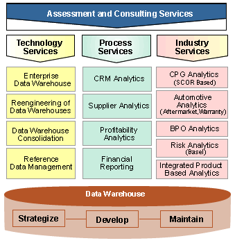 Shinewell offers varied services in the data warehousing / business intelligence area. The key services are highlighted in the figure below.